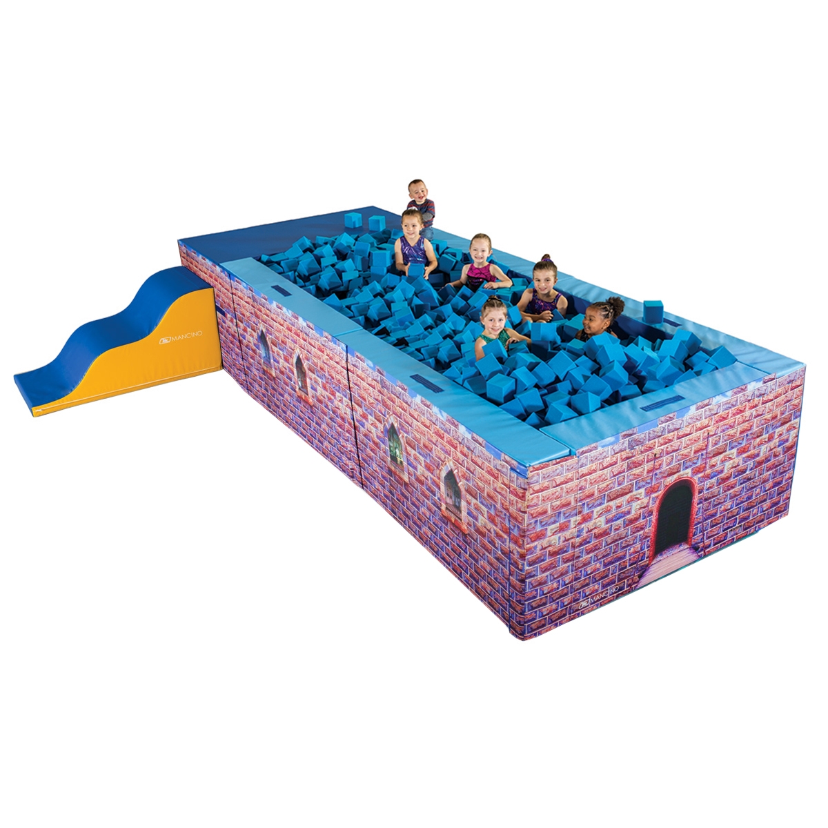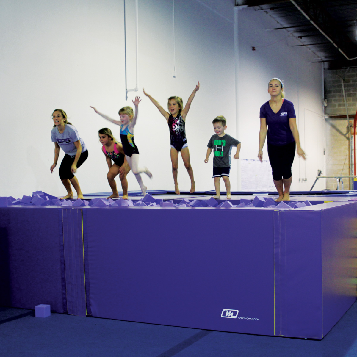 Mancino’s Preschool foam pit is a great addition to any preschool program with no digging! It makes pit time a fun and safe activity for all of your preschool classes. Includes a built-in platform for coaches to stand on to watch tumblers play. With Mancino you have the ability to customize your foam pit to fit your gym graphics. Call for custom graphics or sizes.