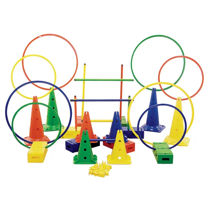Create your own designs with our kids obstacle course! This Steeplecourse movement education and challenge course is just the right size for your gym, classroom, or playground. Tough and heavy enough to use outside with no-slip suction-cup feet. Hoops have flat sides that fit snugly into bricks and cones. Bars fit through cones and bricks. Universal clamps allow one bar to be fastened to another to create hurdles of various heights. Comes in assorted bright primary colors. Comes in assorted bright primary colors.